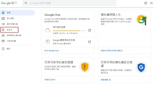 • 步驟1:瀏覽器輸入網址,myaccount.google.com,登入自己的Google帳號,點擊右上角安全性。